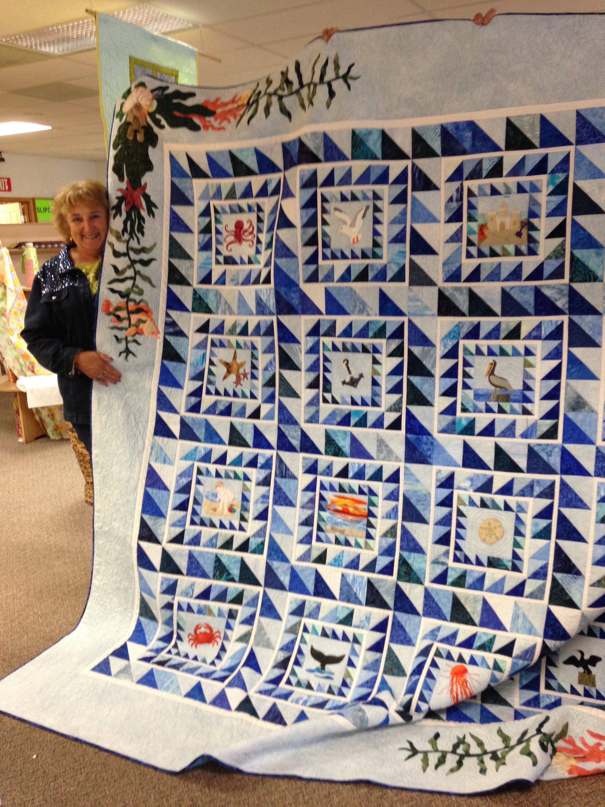 For the guild’s 32nd anniversary, a lovely design by Natalie Crabtree was brought to life by more than thirty members of OCQG. Done in shades of teal and cream with quilting designs that include a mermaid, a ship, and lots of fish and shells, the quilt would be a great addition to a bed or to a wall.