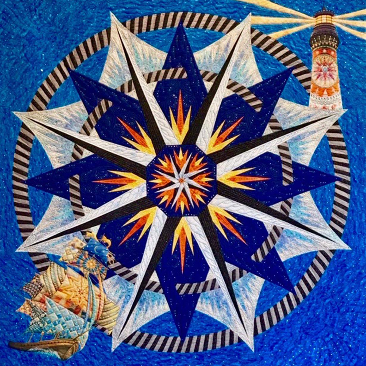 A unique and creative take on the Newport Bridge poster designed for the guild by Dennis McGregor, this wall quilt was designed and created by Meralee Wilson, Jan McQueen, and Jane Szabo, pieced by the 3 designers and Bayshore Quilters, and appliqued by Elizabeth Wood. It is professionally quilted by Lisa Taylor and features a lighthouse, a ship, a mermaid, and other nautical themes. The three dimensional miniature quilts bring the poster to life.
