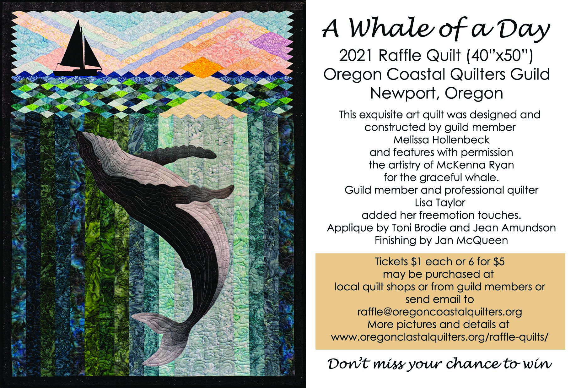 This exquisite art quilt was designed by guild member Melissa Hollenbeck and features, with permission, the artistry of McKenna Ryan for the graceful whale.