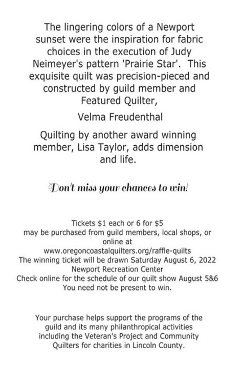 The lingering colors of a Newport sunset were the inspiration for fabric choices in the execution of Judy Neimeyer’s pattern ‘Prairie Star’. This exquisite quilt was precision-pieced and constructed by guild member and Featured Quilter, Velma Freudenthal. Quilting by another award winning member, Lisa Taylor, adds dimension and life.